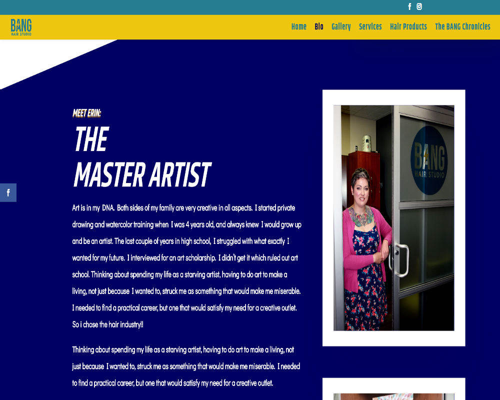 Since privacy is a huge added benefit to being in a studio, incentivizing a personal experience for every client. We thought it was appropriate to simulate a glass door graphic and animation effect on the homepage. Also using very distinct colors we applied a lively atmosphere from head to toe, showcasing the originality and beauty that is Erin's passion for hair.