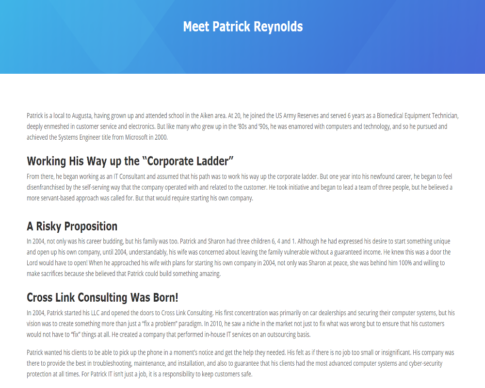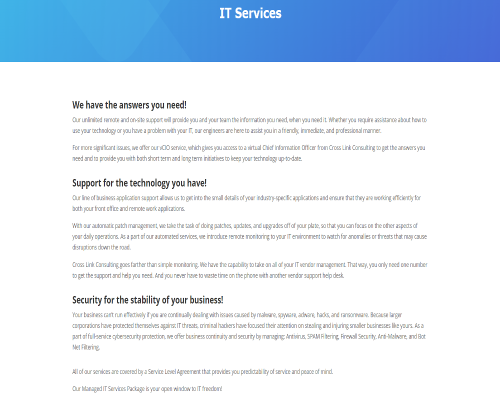 Crosslink Consulting is a local IT Firm in North Augusta, South Carolina. They wanted to get out of one of those long term contract deals, that some digital agencies try to bottleneck clients into. With our no stress commitment to all clients, InnoVationV quickly earned their business.
