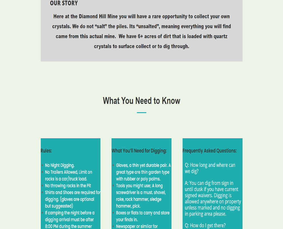 Using the gallery approach, our team took all of the most amazing pieces so we could feature them on the homepage, while reusing some of the most stunning as background pictures for the pricing and contact page. This sites main purpose is to show off what you can get in the mine so we kept it simple, uniformed, and easy to navigate.