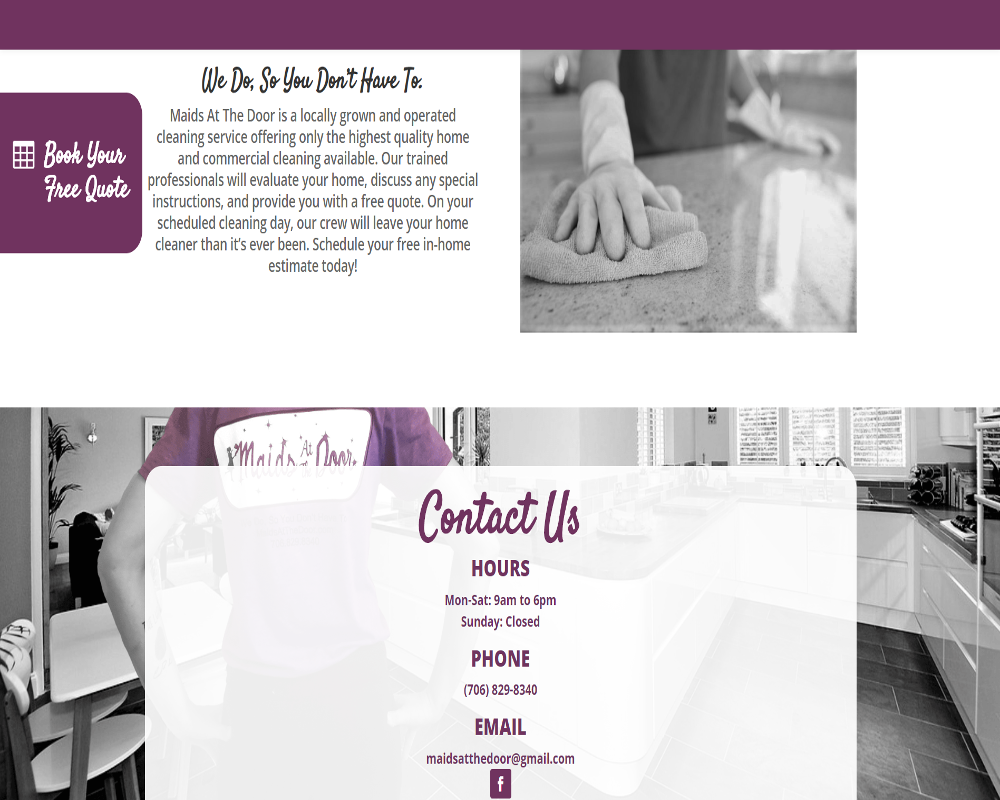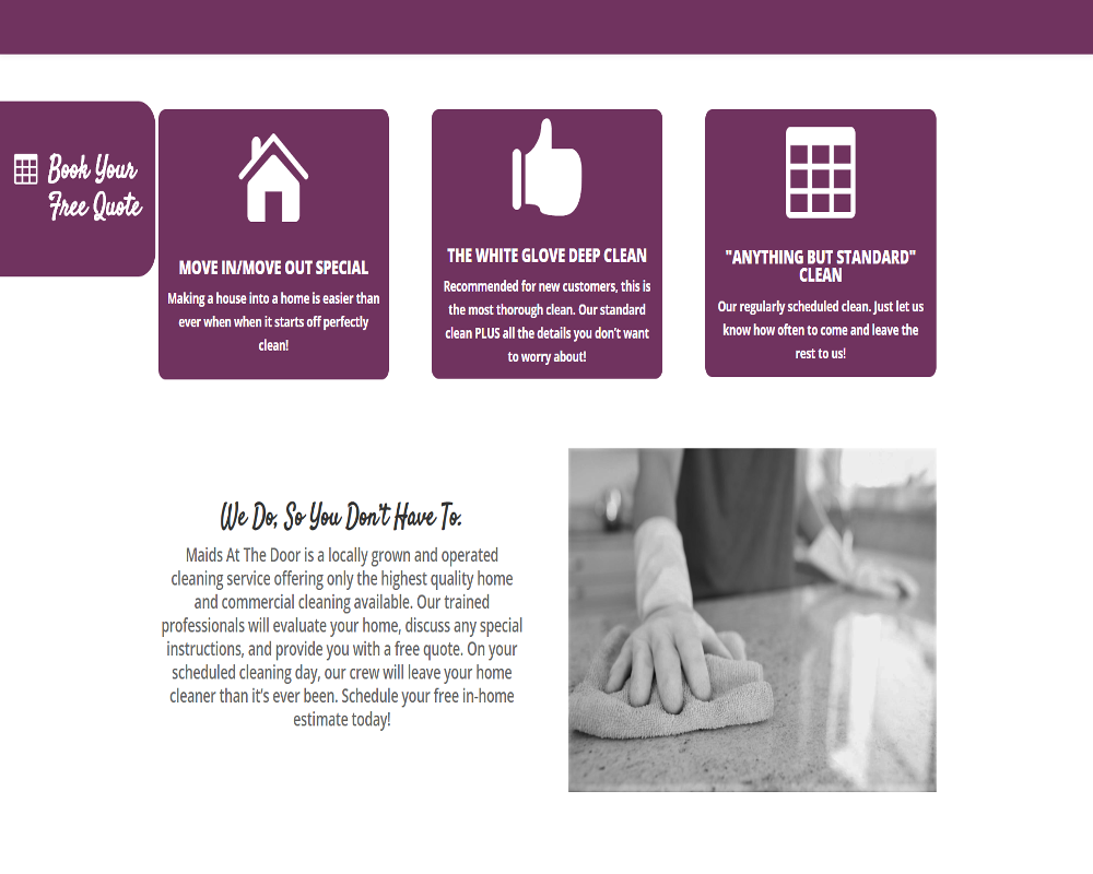 Maids at the door is a small business that needed a small website to handle new and current clients to help scheduling appointments easier. Before, all appointments and estimates were handled manually, and things were getting a bit chaotic as the demand of their services grew.